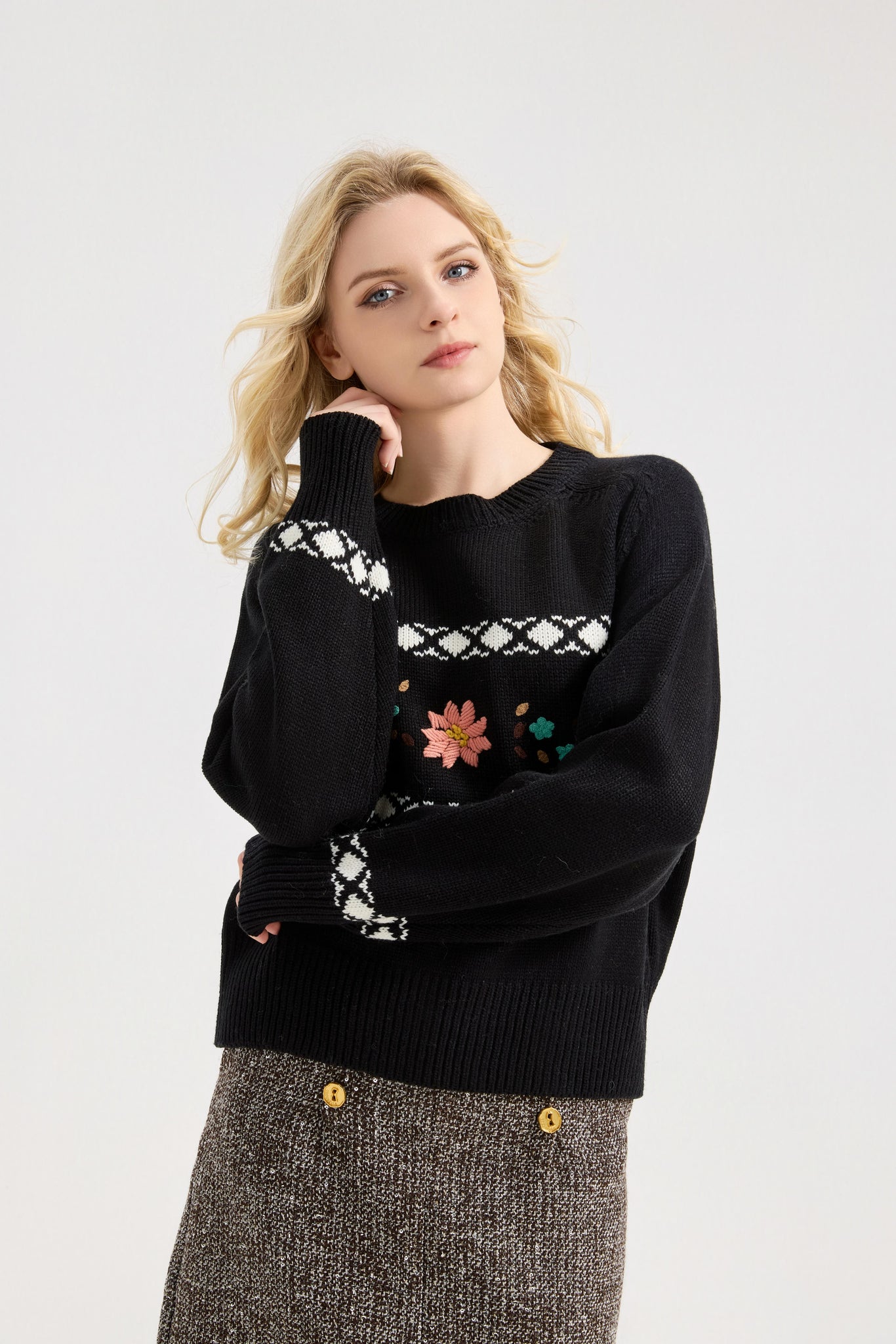 Donna's Embroidered daisy floral Sweater Crewneck Chunky Knit Sweater Pullover
